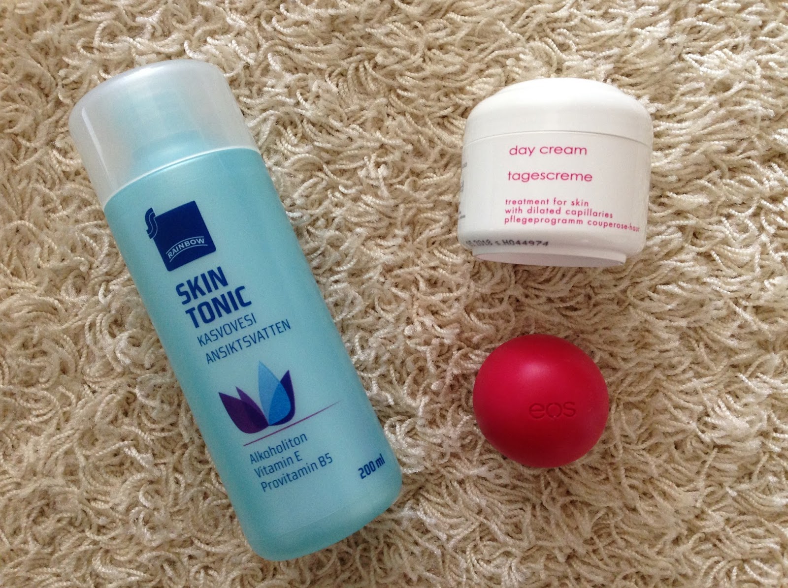 Aamuisin ennen meikin tekoa pyyhin kasvot kasvovedellä ja laitan päivävoiteen kasvoille ja huulille huulirasvaa. Suosin usein halpistuotteita ja oon käyttänyt tuota Rainbown kasvovettä jo ainakin vuoden, haha. Ajaa mun mielestä ihan hyvin asiansa enkä oo huomannut mitään eroa kalliimpiin tuotteisiin verrattuna. Päivävoiteena mulla on tällä hetkellä käytössä kouluaikana hankittu denova-pron päivävoide herkälle- ja couperosa-iholle. Varsinkin näin talvella poskipäät ja nenä punoittaa, niin tuo voide vähän häivyttää sitä. Annan rasvan imeytyä kasvoille hetken ennen kuin aloitan meikkaamisen.